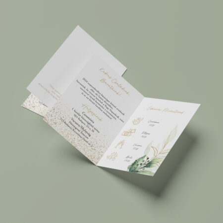 A meghívó 2 oldalt színesen nyomtatott Prémium minőségű, matt kreatív kartonból készül. Pauszpapír borításban, natúr madzaggal átkötve.